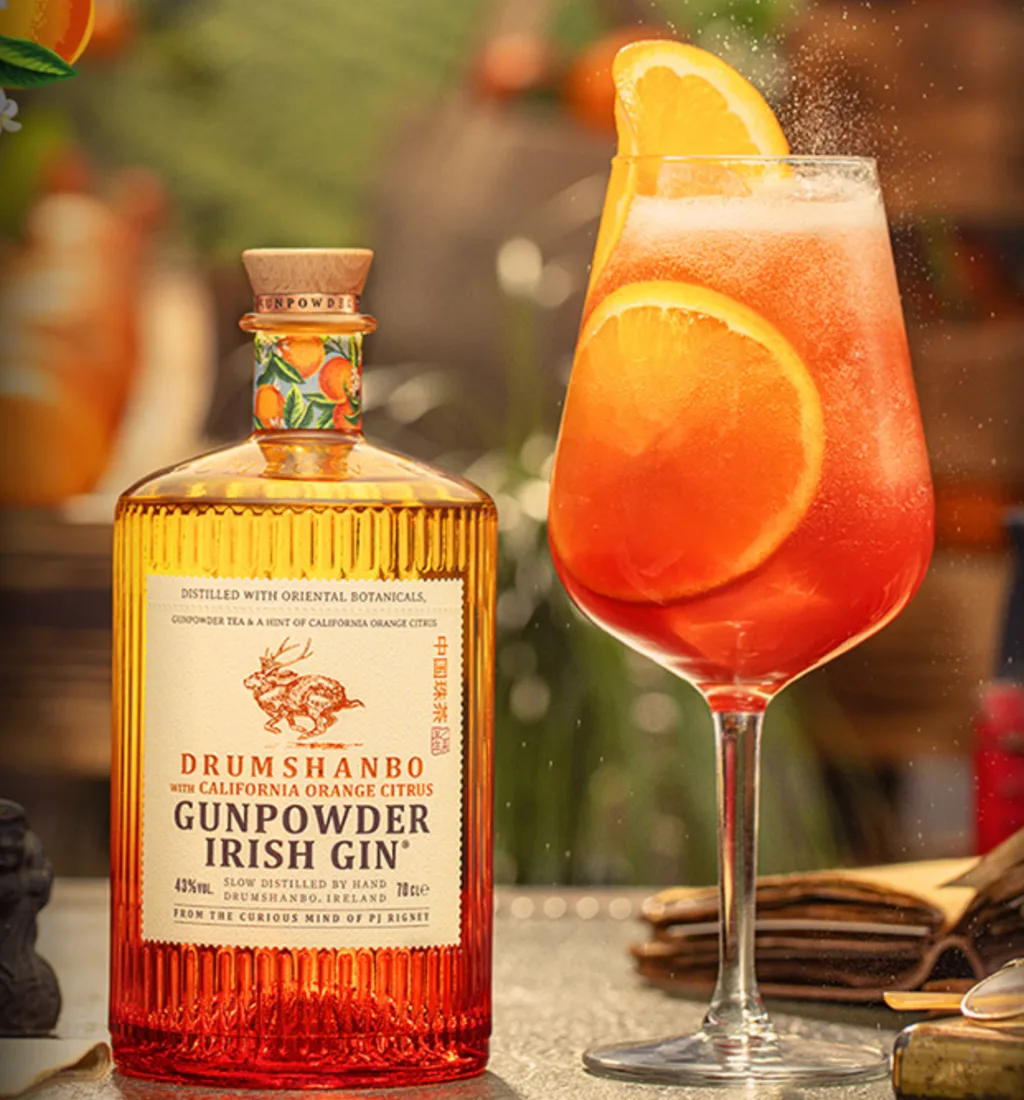 PJ Rigney's Shed Distillery in Co. Leitrim pairs oriental gunpowder tea with eight pot-still and four vapour-infused botanicals, then folds in California oranges picked up on a San Francisco trip. Juniper and green tea underneath, pulpy orange on top. An Irish gin that travels far.
